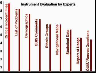 Both the QUIS and Reeves & Harmon questionnaires were rated low by the experts in relation to other instruments. A plausible explanation for weak ratings could be the lack of context these instruments presented. The usefulness of these tools seemed to be limited according to the opinions of the experts.